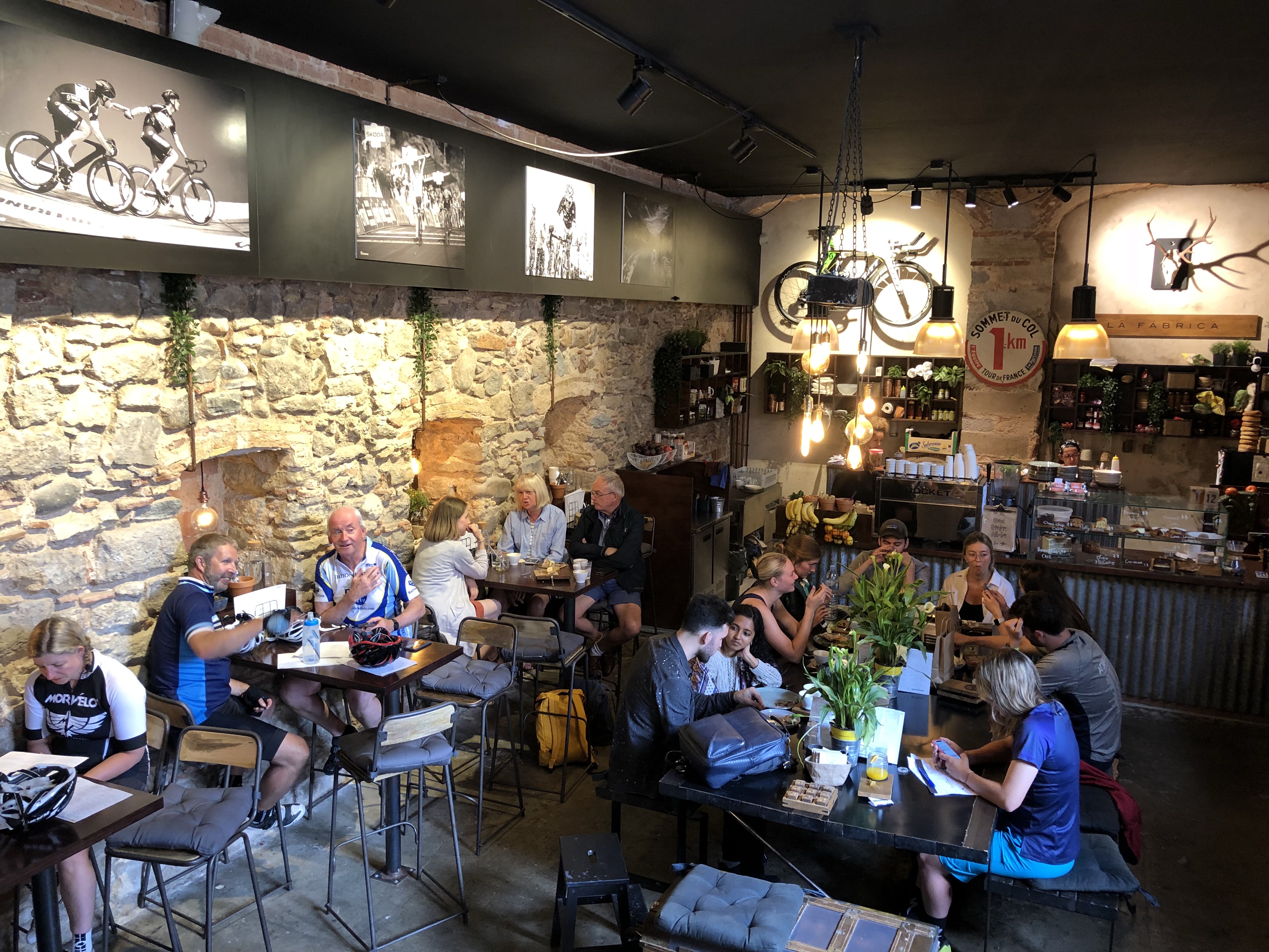Eventually we encountered the cafe that Julie had been talking about for about four days. It was a cycling specific place in the old told of Girona, one of those high ceiling stone walled places with a real sense of history about it. Inside it was full of cycling memorabilia and even the towel in the cloakroom was hung on an old road bike tyre.
