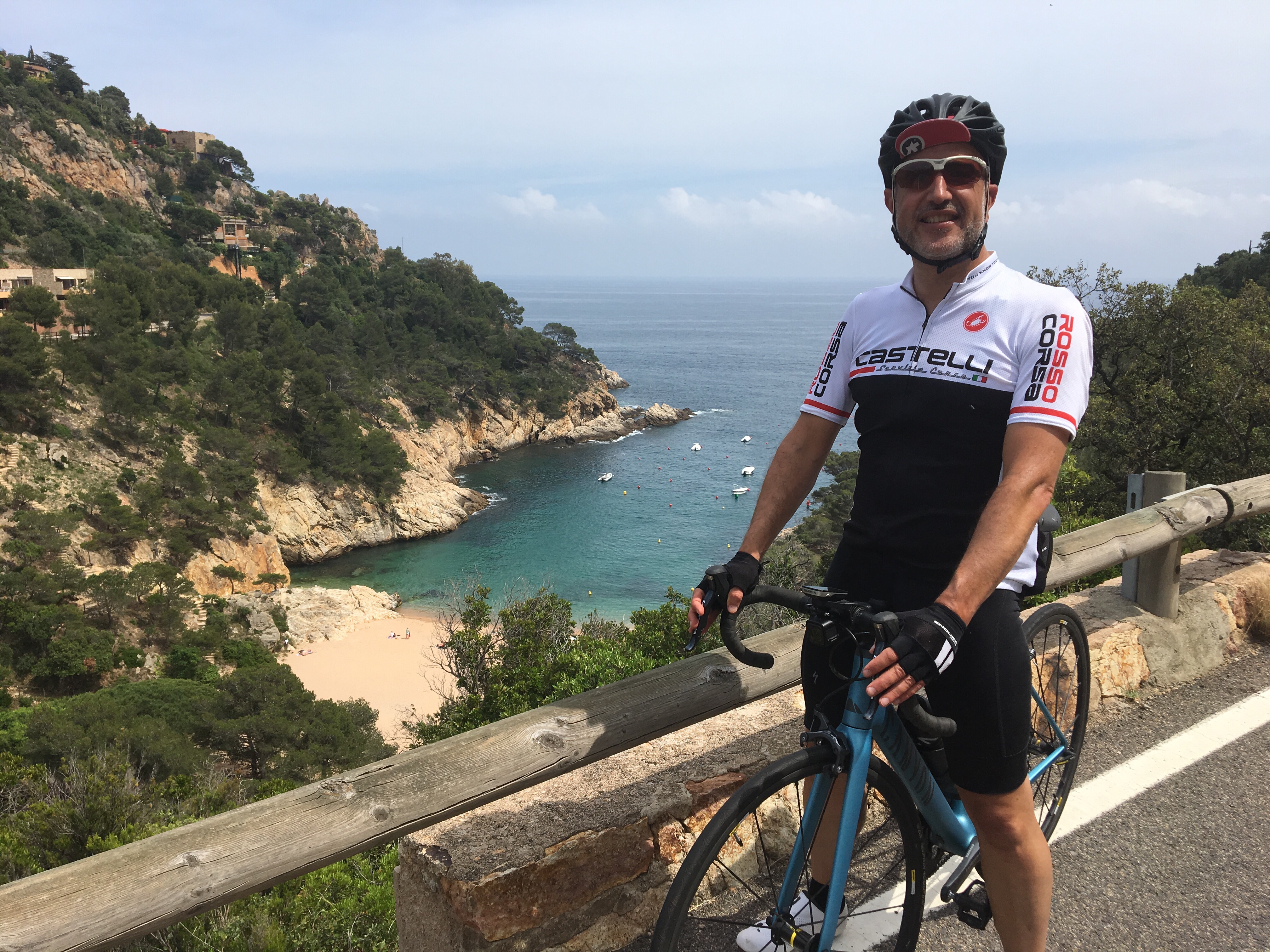 The first part of the departure meant we had to navigate back out of Calonge on the road we had driven in. We knew it was a climb and we also remembered it was likely to be very scenic as the road weaved this way and that with only a crash barrier at the side to keep you from rolling back down the hill. With few cars around, it was a chance to find a gear, pace yourself and get the balance between putting in a good effort without blowing too soon. It was a great hill. With Andy and Archie leading again at the front, I was determined to keep the biggest gear I could which meant pushing hard to keep my legs spinning. I knew the moment I dropped down a gear my legs would lose me that vital yard that is so hard to get back when your buddies are faster. That’s why it turned into such a good section. With every bend came an opportunity to even consider clicking it up a gear to gain some much needed momentum ready for the next section. When we rolled over the top, which had a kind of finish line of it’s own across the road, it wasn’t long before the sweat was pouring out of us as we took a much needed breather at the side of the road to wait for the others. We didn’t need to wait long, they must have enjoyed it as much as we did.